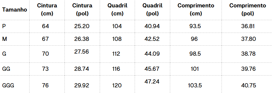 ⚠️ Por se tratar de modelagem chinesa, as medidas podem variar do padrão brasileiro. Recomendamos verificar atentamente a tabela em cm antes da compra para evitar trocas.